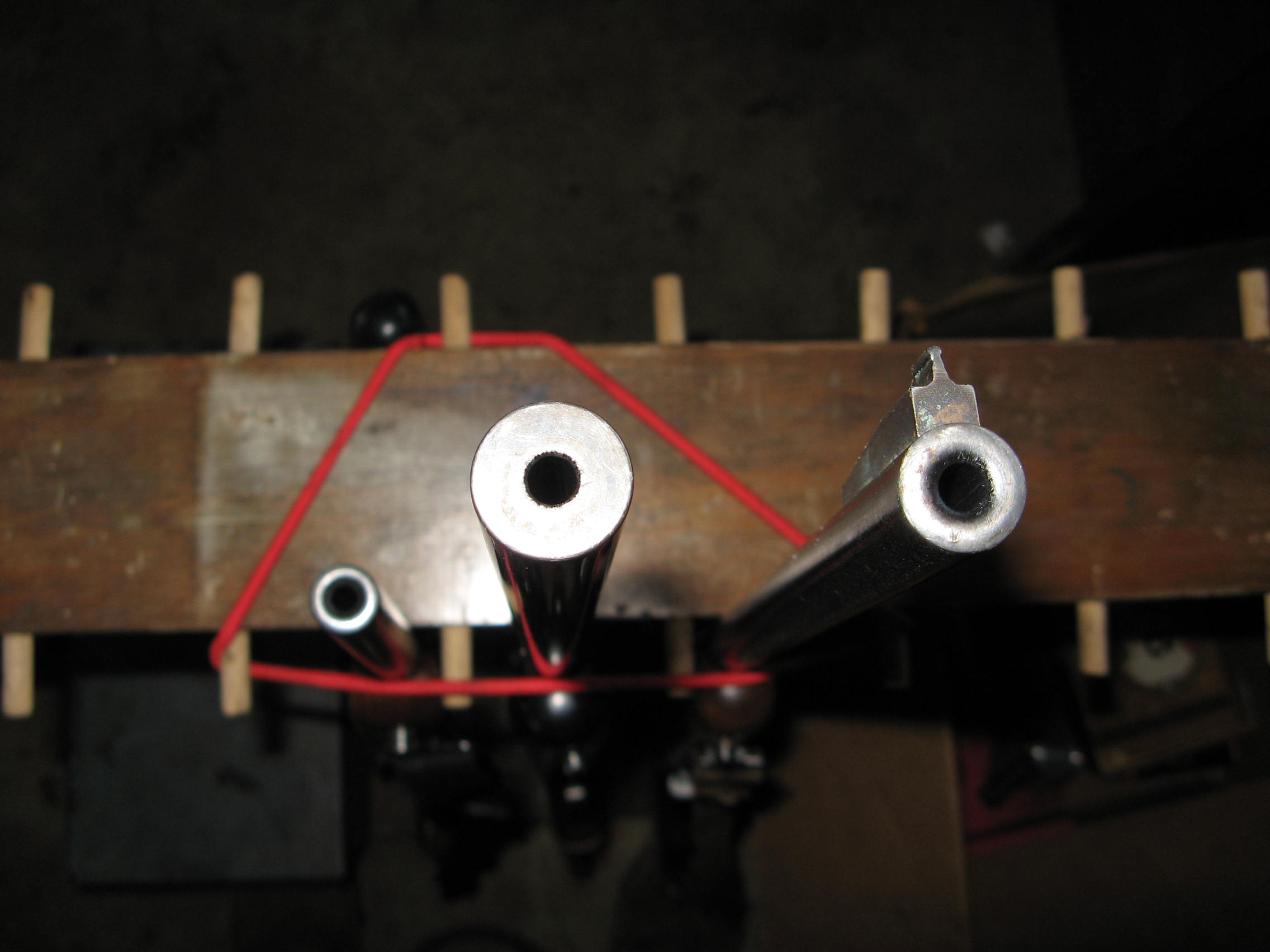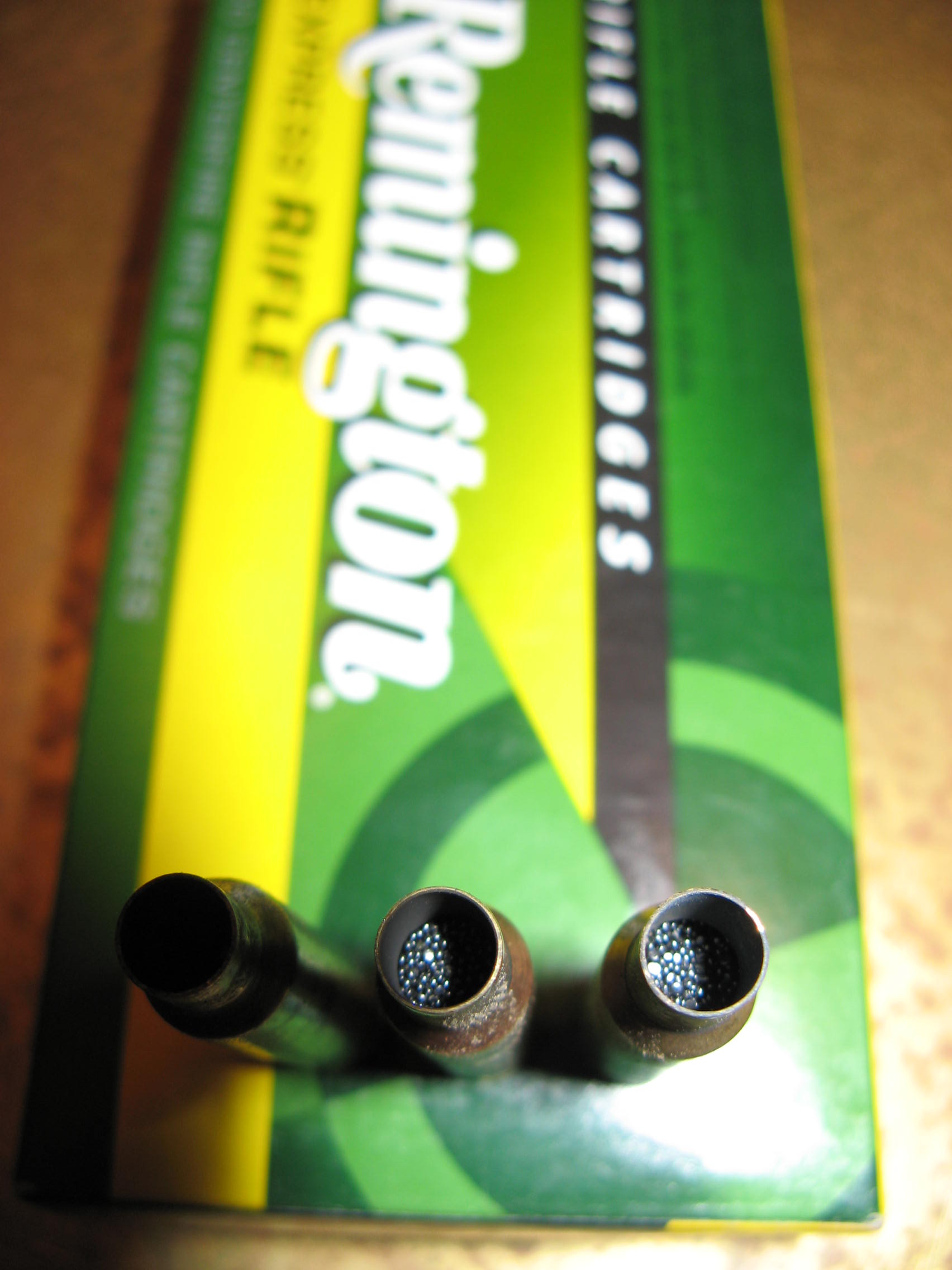 So much for theory. Being a practical type, I lined up the 3 rifles I had on hand, found a batch of cases (ironically made from 223 brass by some zealous person), and matched those up with two boxes of bullets that had been sitting on my bench looking for a rifle that would shoot them well. The first were ultra-modern Hornady 40gr V-Max bullets with bright red polymer tips; the second was a vintage Green card box of Sierra 50gr PSPs that I once tried in my Bee without success. For powder, I decided to use 760 BR for the simple reason that I had two cans and no immediate use for it and I had never tried it in the 222. It’s on the slow side for this cartridge, but it meters really well and the BR on the bottle (presumably for Bench Rest) looked promising. I couldn’t get much more than a mild load of 25 grains into the cases, due to the heavier walls of the 223 donor brass, which only a grain above the starting load in the Lyman manual for either bullet. This did not bother me as accuracy kills rats, not muzzle blast. For primers, I used CCI 550s (small pistol magnum), based on my earlier experience with the Bee and some reading.