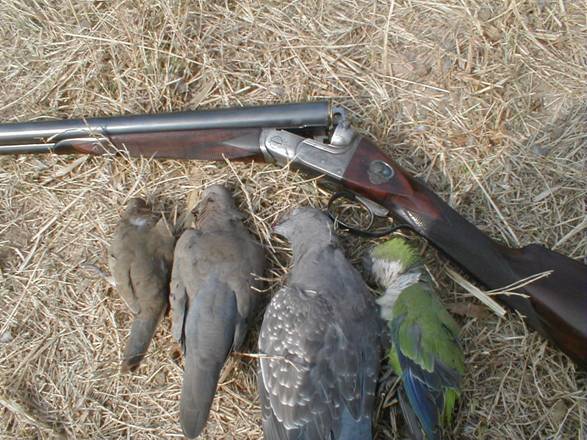 While Monica, Hector and his bird scout stayed with the vehicles, Luis and I took up position in a dry irrigation ditch in the middle of the cornfield. There were a lot of doves and parakeets moving around (the latter very reminiscent of sand grouse in their silhouette and habit of calling as they flew by), with the occasional pigeon as well. But the majority of birds were on the ground feeding. This was normally not a problem with a large group of hunters, but in my case the action was measured. I didn’t need two guns, and I was able to keep up loading my own gun. Luis’ role was to fill my cartridge bag and alert me to birds from behind. Every time I took three or four birds in a row, a small cheer would come from the audience. I found the parakeets more difficult to shoot (and they are as big a pest as the doves) because they were slower but more agile than the doves, oftentimes appearing to swerve to avoid the shot. The pigeons kept their distance mainly, but there were plenty of other targets to keep me busy. Luis would encourage me with a loud “Bravo” whenever I pulled off a tough shot. I soon stood in a circle of “Argentine confetti”. The Greener’s muzzles were coated in black soot for the last two inches, although the powder seemed to leave the bores clean.