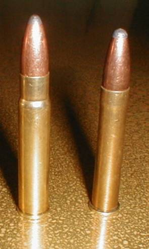 Photograph shows the 375/444 case (left) as loaded with the 235 gr Speer Soft Point, next to the same bullet loaded in