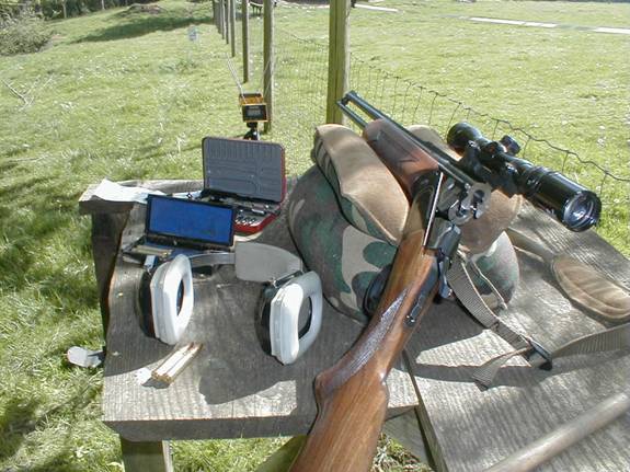 shooting bench showing rifle ready for test-firing. Note chronograph and