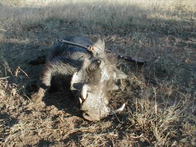 This was one busy hog. To and fro he moved, never still, digging with his tusks and snout in the soft ground. He was moving away from us, so we were forced to follow, crouching and moving only when his head was down. At one point, after gaining some ground, he took off running away from us. Festus assured me we had not been spotted. Bent over and using a large bush for cover, we followed at a trot. After checking and not sighting him, we crossed a larger opening and moved up to a very large and dense bush. I peered round one side while Festus peered round the other. Catching a movement, I saw our hairy friend emerge from a mud wallow, freshly coated in dark mud. He began moving in our direction, so after a whispered evaluation of the situation, I knelt, rifle ready, and watched as he approached in fits and starts, moving diagonally across my front from left to right. The sun was on my left cheek, now low on the horizon, and the wind on my right. Perfect. After a short stop to root around behind a bush, on he came, following a direction that would bring him close to us on the updwind side. I cranked the scope down to 1.5x and got ready. Soon, he appeared, moving at a trot and closing fast. When he was broadside, not 15 yards from us, the bottom barrel barked and the pig sprinted off. Rising, I saw him about sixty yards off, going away, and I let him have the second barrel, snap-shooting. The bullet whined into the distance as the pig collapsed in a large cloud of dust. I reloaded and we closed in, finding him very dead and leaking from both shoulders, through caliber-sized holes. The second shot was a clean miss but unnecessary.