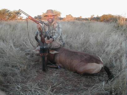 Leaving the trackers to load up the defunct pig, we resumed our brisk walk to a remote area of the property. Nearing the area, we slowed and soon spotted a pair of bulls about 200 yards off. Putting a convenient bush between us and them, we moved closer. At around 125 yards, Jochen halted and we looked them over. One was particularly good, but he had his rear end toward us. I stood behind Jochen, on the shady side of the bush, and moving slowly brought my rifle up, resting on his shoulder. After a minute or so, during which time the animal swapped ends but did not present a good angle, he whispered to put the gun down and relax. I did so, breathing to calm my nerves which were as taught as springs holding the twin internal hammers back. After a minute or so, our quarry, completely unaware of our presence, turned broadside presenting me with a clean shot. The crosshair was a little unsteady on his shoulder, but I took up tension each time it settled on the right spot. Jochen covered his ears with his hands and stood rigidly. Unexpectedly, and thankfully with the crosshairs squarely on the ungainly beast’s shoulders, the shot crashed and a flurry of disappearing Hartebeest ensued. Moving in immediately, ready for a follow-up shot, we found our quarry down not more than 15 paces from where he had stood. His head was up, so I raised the rifle to shoot again, but this proved unnecessary as he flopped over onto his side with a groan, having taken his last breath.